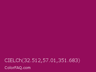 CIELCh 32.512,57.01,351.683 Color is a normal magenta color and the nearest color is Cardinal Pink #8c055e. Hex code #940c5b and RGB value is rgb(148,12,91). In RGB color space, this color is composed of 58% red, 5% green, 36% blue, In CMYK color space, this color is composed of 0% cyan, 92% magenta, 39% yellow , 42% black , In HSL color space, this color has a hue angle of 325° , 85% saturation and 31% lightness.