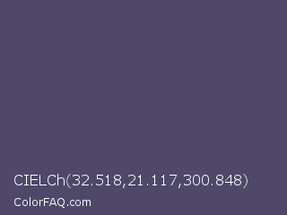 CIELCh 32.518,21.117,300.848 Color is a normal indigo color and the nearest color is Mulled Wine #4e4562. Hex code #4f4869 and RGB value is rgb(79,72,105). In RGB color space, this color is composed of 31% red, 28% green, 41% blue, In CMYK color space, this color is composed of 25% cyan, 31% magenta, 0% yellow , 59% black , In HSL color space, this color has a hue angle of 253° , 19% saturation and 35% lightness.
