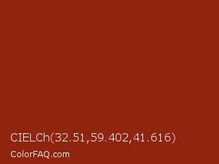 CIELCh 32.51,59.402,41.616 Color is a normal red color and the nearest color is Totem Pole #991b07. Hex code #91240e and RGB value is rgb(145,36,14). In RGB color space, this color is composed of 57% red, 14% green, 5% blue, In CMYK color space, this color is composed of 0% cyan, 75% magenta, 90% yellow , 43% black , In HSL color space, this color has a hue angle of 10° , 82% saturation and 31% lightness.
