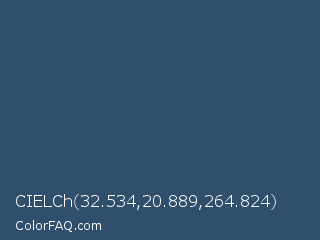 CIELCh 32.534,20.889,264.824 Color is a normal blue color and the nearest color is San Juan #304b6a. Hex code #304f6d and RGB value is rgb(48,79,109). In RGB color space, this color is composed of 19% red, 31% green, 43% blue, In CMYK color space, this color is composed of 56% cyan, 28% magenta, 0% yellow , 57% black , In HSL color space, this color has a hue angle of 210° , 39% saturation and 31% lightness.