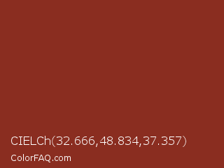 CIELCh 32.666,48.834,37.357 Color is a normal red color and the nearest color is Burnt Umber #8a3324. Hex code #8a2d20 and RGB value is rgb(138,45,32). In RGB color space, this color is composed of 54% red, 18% green, 13% blue, In CMYK color space, this color is composed of 0% cyan, 67% magenta, 77% yellow , 46% black , In HSL color space, this color has a hue angle of 7° , 62% saturation and 33% lightness.