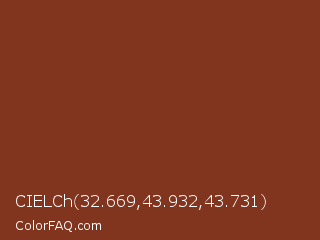 CIELCh 32.669,43.932,43.731 Color is a normal red color and the nearest color is Red Robin #80341f. Hex code #82351e and RGB value is rgb(130,53,30). In RGB color space, this color is composed of 51% red, 21% green, 12% blue, In CMYK color space, this color is composed of 0% cyan, 59% magenta, 77% yellow , 49% black , In HSL color space, this color has a hue angle of 14° , 63% saturation and 31% lightness.