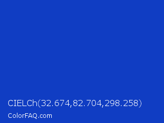 CIELCh 32.674,82.704,298.258 Color is a normal blue color and the nearest color is Persian Blue #1c39bb. Hex code #103dc3 and RGB value is rgb(16,61,195). In RGB color space, this color is composed of 6% red, 24% green, 76% blue, In CMYK color space, this color is composed of 92% cyan, 69% magenta, 0% yellow , 24% black , In HSL color space, this color has a hue angle of 225° , 85% saturation and 41% lightness.