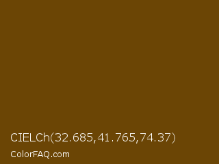 CIELCh 32.685,41.765,74.37 Color is a very dark orange color and the nearest color is Antique Bronze #704a07. Hex code #6b4505 and RGB value is rgb(107,69,5). In RGB color space, this color is composed of 42% red, 27% green, 2% blue, In CMYK color space, this color is composed of 0% cyan, 36% magenta, 95% yellow , 58% black , In HSL color space, this color has a hue angle of 38° , 91% saturation and 22% lightness.