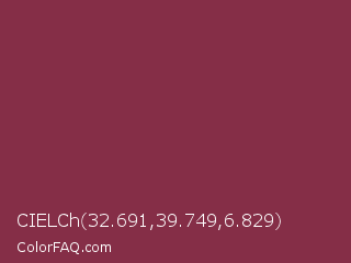 CIELCh 32.691,39.749,6.829 Color is a normal rose color and the nearest color is Solid Pink #893843. Hex code #852e47 and RGB value is rgb(133,46,71). In RGB color space, this color is composed of 52% red, 18% green, 28% blue, In CMYK color space, this color is composed of 0% cyan, 65% magenta, 47% yellow , 48% black , In HSL color space, this color has a hue angle of 343° , 49% saturation and 35% lightness.