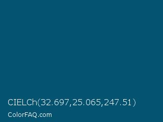 CIELCh 32.697,25.065,247.51 Color is a dark blue color and the nearest color is Deep Imperial Blue #00416a. Hex code #035371 and RGB value is rgb(3,83,113). In RGB color space, this color is composed of 1% red, 33% green, 44% blue, In CMYK color space, this color is composed of 97% cyan, 27% magenta, 0% yellow , 56% black , In HSL color space, this color has a hue angle of 196° , 95% saturation and 23% lightness.