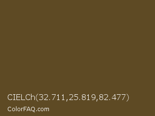CIELCh 32.711,25.819,82.477 Color is a dark orange color and the nearest color is Donkey Brown #664c28. Hex code #5e4a24 and RGB value is rgb(94,74,36). In RGB color space, this color is composed of 37% red, 29% green, 14% blue, In CMYK color space, this color is composed of 0% cyan, 21% magenta, 62% yellow , 63% black , In HSL color space, this color has a hue angle of 39° , 45% saturation and 25% lightness.