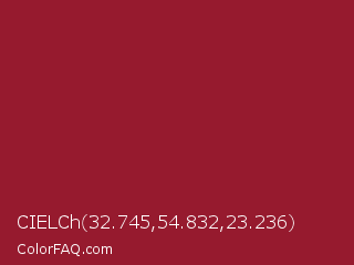 CIELCh 32.745,54.832,23.236 Color is a normal red color and the nearest color is Vivid Burgundy #9f1d35. Hex code #961a2e and RGB value is rgb(150,26,46). In RGB color space, this color is composed of 59% red, 10% green, 18% blue, In CMYK color space, this color is composed of 0% cyan, 83% magenta, 69% yellow , 41% black , In HSL color space, this color has a hue angle of 350° , 70% saturation and 35% lightness.