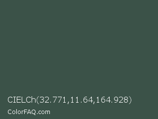 CIELCh 32.771,11.64,164.928 Color is a dark green color and the nearest color is Outer Space #414a4c. Hex code #3b5248 and RGB value is rgb(59,82,72). In RGB color space, this color is composed of 23% red, 32% green, 28% blue, In CMYK color space, this color is composed of 28% cyan, 0% magenta, 12% yellow , 68% black , In HSL color space, this color has a hue angle of 154° , 16% saturation and 28% lightness.