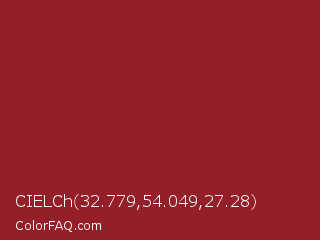 CIELCh 32.779,54.049,27.28 Color is a normal red color and the nearest color is Vivid Auburn #922724. Hex code #941f29 and RGB value is rgb(148,31,41). In RGB color space, this color is composed of 58% red, 12% green, 16% blue, In CMYK color space, this color is composed of 0% cyan, 79% magenta, 72% yellow , 42% black , In HSL color space, this color has a hue angle of 355° , 65% saturation and 35% lightness.