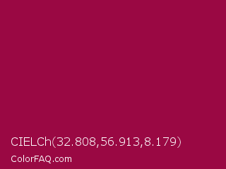 CIELCh 32.808,56.913,8.179 Color is a normal rose color and the nearest color is Pink Raspberry #980036. Hex code #9a0843 and RGB value is rgb(154,8,67). In RGB color space, this color is composed of 60% red, 3% green, 26% blue, In CMYK color space, this color is composed of 0% cyan, 95% magenta, 56% yellow , 40% black , In HSL color space, this color has a hue angle of 336° , 90% saturation and 32% lightness.