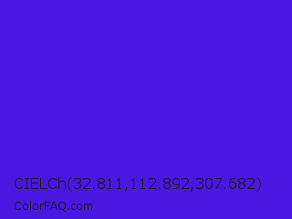 CIELCh 32.811,112.892,307.682 Color is a normal indigo color and the nearest color is Han Purple #5218fa. Hex code #4a17e0 and RGB value is rgb(74,23,224). In RGB color space, this color is composed of 29% red, 9% green, 88% blue, In CMYK color space, this color is composed of 67% cyan, 90% magenta, 0% yellow , 12% black , In HSL color space, this color has a hue angle of 255° , 81% saturation and 48% lightness.