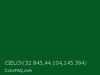 CIELCh 32.845,44.104,145.394 Color is a very dark green color and the nearest color is Camarone #00581a. Hex code #055a23 and RGB value is rgb(5,90,35). In RGB color space, this color is composed of 2% red, 35% green, 14% blue, In CMYK color space, this color is composed of 94% cyan, 0% magenta, 61% yellow , 65% black , In HSL color space, this color has a hue angle of 141° , 89% saturation and 19% lightness.