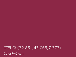 CIELCh 32.851,45.065,7.373 Color is a normal rose color and the nearest color is Big Dip O Ruby #9c2542. Hex code #8c2746 and RGB value is rgb(140,39,70). In RGB color space, this color is composed of 55% red, 15% green, 27% blue, In CMYK color space, this color is composed of 0% cyan, 72% magenta, 50% yellow , 45% black , In HSL color space, this color has a hue angle of 342° , 56% saturation and 35% lightness.