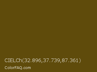 CIELCh 32.896,37.739,87.361 Color is a very dark yellow color and the nearest color is Horses Neck #604913. Hex code #5f4b0b and RGB value is rgb(95,75,11). In RGB color space, this color is composed of 37% red, 29% green, 4% blue, In CMYK color space, this color is composed of 0% cyan, 21% magenta, 88% yellow , 63% black , In HSL color space, this color has a hue angle of 46° , 79% saturation and 21% lightness.