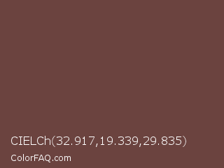 CIELCh 32.917,19.339,29.835 Color is a normal red color and the nearest color is Roast Coffee #704241. Hex code #6b433f and RGB value is rgb(107,67,63). In RGB color space, this color is composed of 42% red, 26% green, 25% blue, In CMYK color space, this color is composed of 0% cyan, 37% magenta, 41% yellow , 58% black , In HSL color space, this color has a hue angle of 5° , 26% saturation and 33% lightness.