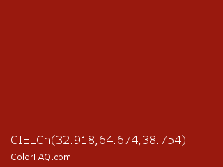 CIELCh 32.918,64.674,38.754 Color is a normal red color and the nearest color is Tamarillo #991613. Hex code #99190e and RGB value is rgb(153,25,14). In RGB color space, this color is composed of 60% red, 10% green, 5% blue, In CMYK color space, this color is composed of 0% cyan, 84% magenta, 91% yellow , 40% black , In HSL color space, this color has a hue angle of 5° , 83% saturation and 33% lightness.