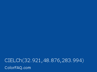 CIELCh 32.921,48.876,283.994 Color is a normal blue color and the nearest color is Medium Electric Blue #035096. Hex code #054c99 and RGB value is rgb(5,76,153). In RGB color space, this color is composed of 2% red, 30% green, 60% blue, In CMYK color space, this color is composed of 97% cyan, 50% magenta, 0% yellow , 40% black , In HSL color space, this color has a hue angle of 211° , 94% saturation and 31% lightness.