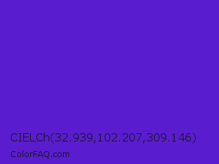 CIELCh 32.939,102.207,309.146 Color is a normal violet color and the nearest color is Purple Heart Crayola #652dc1. Hex code #5a1ccf and RGB value is rgb(90,28,207). In RGB color space, this color is composed of 35% red, 11% green, 81% blue, In CMYK color space, this color is composed of 57% cyan, 86% magenta, 0% yellow , 19% black , In HSL color space, this color has a hue angle of 261° , 76% saturation and 46% lightness.
