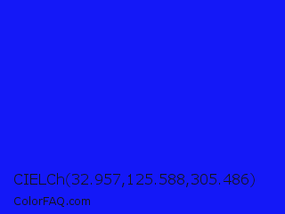 CIELCh 32.957,125.588,305.486 Color is a normal blue color and the nearest color is Bluebonnet #1c1cf0. Hex code #1418f7 and RGB value is rgb(20,24,247). In RGB color space, this color is composed of 8% red, 9% green, 97% blue, In CMYK color space, this color is composed of 92% cyan, 90% magenta, 0% yellow , 3% black , In HSL color space, this color has a hue angle of 239° , 93% saturation and 52% lightness.