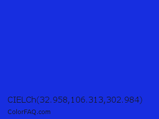 CIELCh 32.958,106.313,302.984 Color is a normal blue color and the nearest color is Palatinate Blue #273be2. Hex code #172ee0 and RGB value is rgb(23,46,224). In RGB color space, this color is composed of 9% red, 18% green, 88% blue, In CMYK color space, this color is composed of 90% cyan, 79% magenta, 0% yellow , 12% black , In HSL color space, this color has a hue angle of 233° , 81% saturation and 48% lightness.
