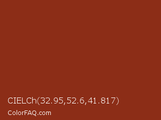 CIELCh 32.95,52.6,41.817 Color is a normal red color and the nearest color is Kobe #882d17. Hex code #8c2d17 and RGB value is rgb(140,45,23). In RGB color space, this color is composed of 55% red, 18% green, 9% blue, In CMYK color space, this color is composed of 0% cyan, 68% magenta, 84% yellow , 45% black , In HSL color space, this color has a hue angle of 11° , 72% saturation and 32% lightness.