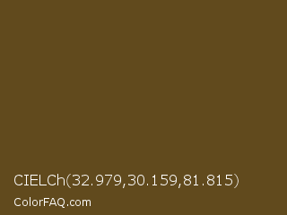 CIELCh 32.979,30.159,81.815 Color is a dark orange color and the nearest color is West Coast #625119. Hex code #614a1d and RGB value is rgb(97,74,29). In RGB color space, this color is composed of 38% red, 29% green, 11% blue, In CMYK color space, this color is composed of 0% cyan, 24% magenta, 70% yellow , 62% black , In HSL color space, this color has a hue angle of 40° , 54% saturation and 25% lightness.