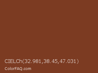 CIELCh 32.981,38.45,47.031 Color is a normal orange color and the nearest color is Red Robin #80341f. Hex code #7c3b22 and RGB value is rgb(124,59,34). In RGB color space, this color is composed of 49% red, 23% green, 13% blue, In CMYK color space, this color is composed of 0% cyan, 52% magenta, 73% yellow , 51% black , In HSL color space, this color has a hue angle of 17° , 57% saturation and 31% lightness.