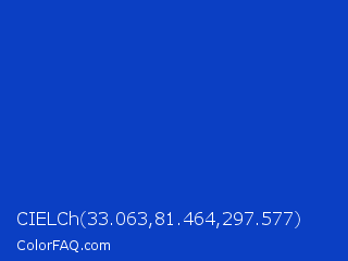 CIELCh 33.063,81.464,297.577 Color is a normal blue color and the nearest color is Absolute Zero #0048ba. Hex code #0b3fc3 and RGB value is rgb(11,63,195). In RGB color space, this color is composed of 4% red, 25% green, 76% blue, In CMYK color space, this color is composed of 94% cyan, 68% magenta, 0% yellow , 24% black , In HSL color space, this color has a hue angle of 223° , 89% saturation and 40% lightness.