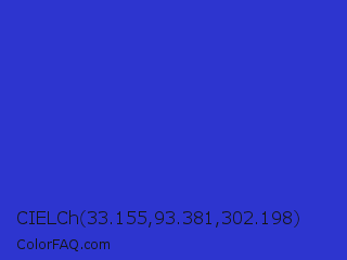 CIELCh 33.155,93.381,302.198 Color is a normal blue color and the nearest color is Palatinate Blue #273be2. Hex code #2d35cf and RGB value is rgb(45,53,207). In RGB color space, this color is composed of 18% red, 21% green, 81% blue, In CMYK color space, this color is composed of 78% cyan, 74% magenta, 0% yellow , 19% black , In HSL color space, this color has a hue angle of 237° , 64% saturation and 49% lightness.