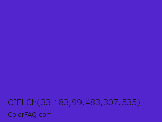 CIELCh 33.183,99.483,307.535 Color is a normal indigo color and the nearest color is Purple Heart Crayola #652dc1. Hex code #5225cf and RGB value is rgb(82,37,207). In RGB color space, this color is composed of 32% red, 15% green, 81% blue, In CMYK color space, this color is composed of 60% cyan, 82% magenta, 0% yellow , 19% black , In HSL color space, this color has a hue angle of 256° , 70% saturation and 48% lightness.