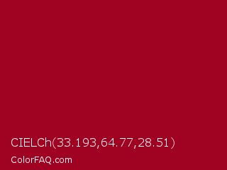 CIELCh 33.193,64.77,28.51 Color is a normal red color and the nearest color is Carmine #960018. Hex code #a00221 and RGB value is rgb(160,2,33). In RGB color space, this color is composed of 63% red, 1% green, 13% blue, In CMYK color space, this color is composed of 0% cyan, 99% magenta, 79% yellow , 37% black , In HSL color space, this color has a hue angle of 348° , 98% saturation and 32% lightness.