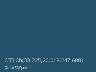 CIELCh 33.225,20.018,247.688 Color is a dark blue color and the nearest color is San Juan #304b6a. Hex code #25536b and RGB value is rgb(37,83,107). In RGB color space, this color is composed of 15% red, 33% green, 42% blue, In CMYK color space, this color is composed of 65% cyan, 22% magenta, 0% yellow , 58% black , In HSL color space, this color has a hue angle of 201° , 49% saturation and 28% lightness.