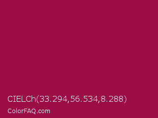 CIELCh 33.294,56.534,8.288 Color is a normal rose color and the nearest color is Pink Raspberry #980036. Hex code #9b0d44 and RGB value is rgb(155,13,68). In RGB color space, this color is composed of 61% red, 5% green, 27% blue, In CMYK color space, this color is composed of 0% cyan, 92% magenta, 56% yellow , 39% black , In HSL color space, this color has a hue angle of 337° , 85% saturation and 33% lightness.