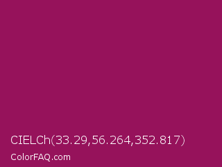CIELCh 33.29,56.264,352.817 Color is a normal magenta color and the nearest color is Cardinal Pink #8c055e. Hex code #96125b and RGB value is rgb(150,18,91). In RGB color space, this color is composed of 59% red, 7% green, 36% blue, In CMYK color space, this color is composed of 0% cyan, 88% magenta, 39% yellow , 41% black , In HSL color space, this color has a hue angle of 327° , 79% saturation and 33% lightness.