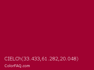 CIELCh 33.433,61.282,20.048 Color is a normal rose color and the nearest color is Pink Raspberry #980036. Hex code #a00231 and RGB value is rgb(160,2,49). In RGB color space, this color is composed of 63% red, 1% green, 19% blue, In CMYK color space, this color is composed of 0% cyan, 99% magenta, 69% yellow , 37% black , In HSL color space, this color has a hue angle of 342° , 98% saturation and 32% lightness.