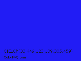 CIELCh 33.449,123.139,305.459 Color is a normal indigo color and the nearest color is Bluebonnet #1c1cf0. Hex code #211cf5 and RGB value is rgb(33,28,245). In RGB color space, this color is composed of 13% red, 11% green, 96% blue, In CMYK color space, this color is composed of 87% cyan, 89% magenta, 0% yellow , 4% black , In HSL color space, this color has a hue angle of 241° , 92% saturation and 54% lightness.