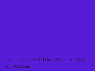 CIELCh 33.484,106.209,308.596 Color is a normal indigo color and the nearest color is Purple Heart Crayola #652dc1. Hex code #571cd7 and RGB value is rgb(87,28,215). In RGB color space, this color is composed of 34% red, 11% green, 84% blue, In CMYK color space, this color is composed of 60% cyan, 87% magenta, 0% yellow , 16% black , In HSL color space, this color has a hue angle of 259° , 77% saturation and 48% lightness.