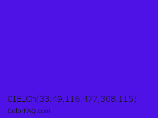 CIELCh 33.49,116.477,308.115 Color is a normal indigo color and the nearest color is Han Purple #5218fa. Hex code #4e12e6 and RGB value is rgb(78,18,230). In RGB color space, this color is composed of 31% red, 7% green, 90% blue, In CMYK color space, this color is composed of 66% cyan, 92% magenta, 0% yellow , 10% black , In HSL color space, this color has a hue angle of 257° , 85% saturation and 49% lightness.