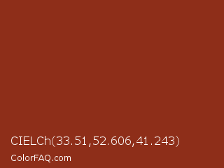 CIELCh 33.51,52.606,41.243 Color is a normal red color and the nearest color is Kobe #882d17. Hex code #8e2e19 and RGB value is rgb(142,46,25). In RGB color space, this color is composed of 56% red, 18% green, 10% blue, In CMYK color space, this color is composed of 0% cyan, 68% magenta, 82% yellow , 44% black , In HSL color space, this color has a hue angle of 11° , 70% saturation and 33% lightness.