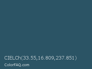 CIELCh 33.55,16.809,237.851 Color is a dark blue color and the nearest color is San Juan #304b6a. Hex code #2b5465 and RGB value is rgb(43,84,101). In RGB color space, this color is composed of 17% red, 33% green, 40% blue, In CMYK color space, this color is composed of 57% cyan, 17% magenta, 0% yellow , 60% black , In HSL color space, this color has a hue angle of 198° , 40% saturation and 28% lightness.