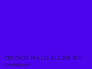 CIELCh 33.564,121.812,308.367 Color is a normal indigo color and the nearest color is Electric Ultramarine #3f00ff. Hex code #4d05ed and RGB value is rgb(77,5,237). In RGB color space, this color is composed of 30% red, 2% green, 93% blue, In CMYK color space, this color is composed of 68% cyan, 98% magenta, 0% yellow , 7% black , In HSL color space, this color has a hue angle of 259° , 96% saturation and 47% lightness.
