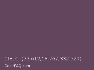 CIELCh 33.612,18.767,332.529 Color is a normal magenta color and the nearest color is Eggplant #614051. Hex code #63465d and RGB value is rgb(99,70,93). In RGB color space, this color is composed of 39% red, 27% green, 36% blue, In CMYK color space, this color is composed of 0% cyan, 29% magenta, 6% yellow , 61% black , In HSL color space, this color has a hue angle of 312° , 17% saturation and 33% lightness.
