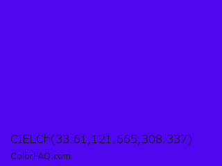 CIELCh 33.61,121.665,308.337 Color is a normal indigo color and the nearest color is Han Purple #5218fa. Hex code #4d06ed and RGB value is rgb(77,6,237). In RGB color space, this color is composed of 30% red, 2% green, 93% blue, In CMYK color space, this color is composed of 68% cyan, 97% magenta, 0% yellow , 7% black , In HSL color space, this color has a hue angle of 258° , 95% saturation and 48% lightness.
