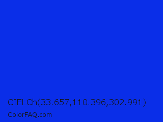 CIELCh 33.657,110.396,302.991 Color is a normal blue color and the nearest color is Bluebonnet #1c1cf0. Hex code #0a2ee8 and RGB value is rgb(10,46,232). In RGB color space, this color is composed of 4% red, 18% green, 91% blue, In CMYK color space, this color is composed of 96% cyan, 80% magenta, 0% yellow , 9% black , In HSL color space, this color has a hue angle of 230° , 92% saturation and 47% lightness.