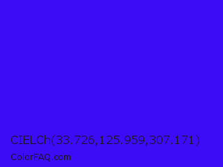 CIELCh 33.726,125.959,307.171 Color is a normal indigo color and the nearest color is Electric Ultramarine #3f00ff. Hex code #3c0cf6 and RGB value is rgb(60,12,246). In RGB color space, this color is composed of 24% red, 5% green, 96% blue, In CMYK color space, this color is composed of 76% cyan, 95% magenta, 0% yellow , 4% black , In HSL color space, this color has a hue angle of 252° , 93% saturation and 51% lightness.