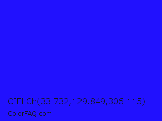 CIELCh 33.732,129.849,306.115 Color is a normal indigo color and the nearest color is Bluebonnet #1c1cf0. Hex code #2111fe and RGB value is rgb(33,17,254). In RGB color space, this color is composed of 13% red, 7% green, 100% blue, In CMYK color space, this color is composed of 87% cyan, 93% magenta, 0% yellow , 0% black , In HSL color space, this color has a hue angle of 244° , 99% saturation and 53% lightness.