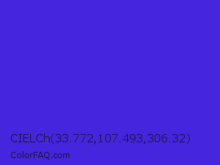 CIELCh 33.772,107.493,306.32 Color is a normal indigo color and the nearest color is Han Purple #5218fa. Hex code #4625de and RGB value is rgb(70,37,222). In RGB color space, this color is composed of 27% red, 15% green, 87% blue, In CMYK color space, this color is composed of 68% cyan, 83% magenta, 0% yellow , 13% black , In HSL color space, this color has a hue angle of 251° , 74% saturation and 51% lightness.