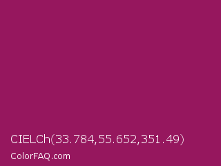 CIELCh 33.784,55.652,351.49 Color is a normal magenta color and the nearest color is Jazzberry Jam #a50b5e. Hex code #96175e and RGB value is rgb(150,23,94). In RGB color space, this color is composed of 59% red, 9% green, 37% blue, In CMYK color space, this color is composed of 0% cyan, 85% magenta, 37% yellow , 41% black , In HSL color space, this color has a hue angle of 326° , 73% saturation and 34% lightness.