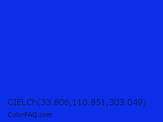 CIELCh 33.806,110.851,303.049 Color is a normal blue color and the nearest color is Bluebonnet #1c1cf0. Hex code #0c2ee9 and RGB value is rgb(12,46,233). In RGB color space, this color is composed of 5% red, 18% green, 91% blue, In CMYK color space, this color is composed of 95% cyan, 80% magenta, 0% yellow , 9% black , In HSL color space, this color has a hue angle of 231° , 90% saturation and 48% lightness.